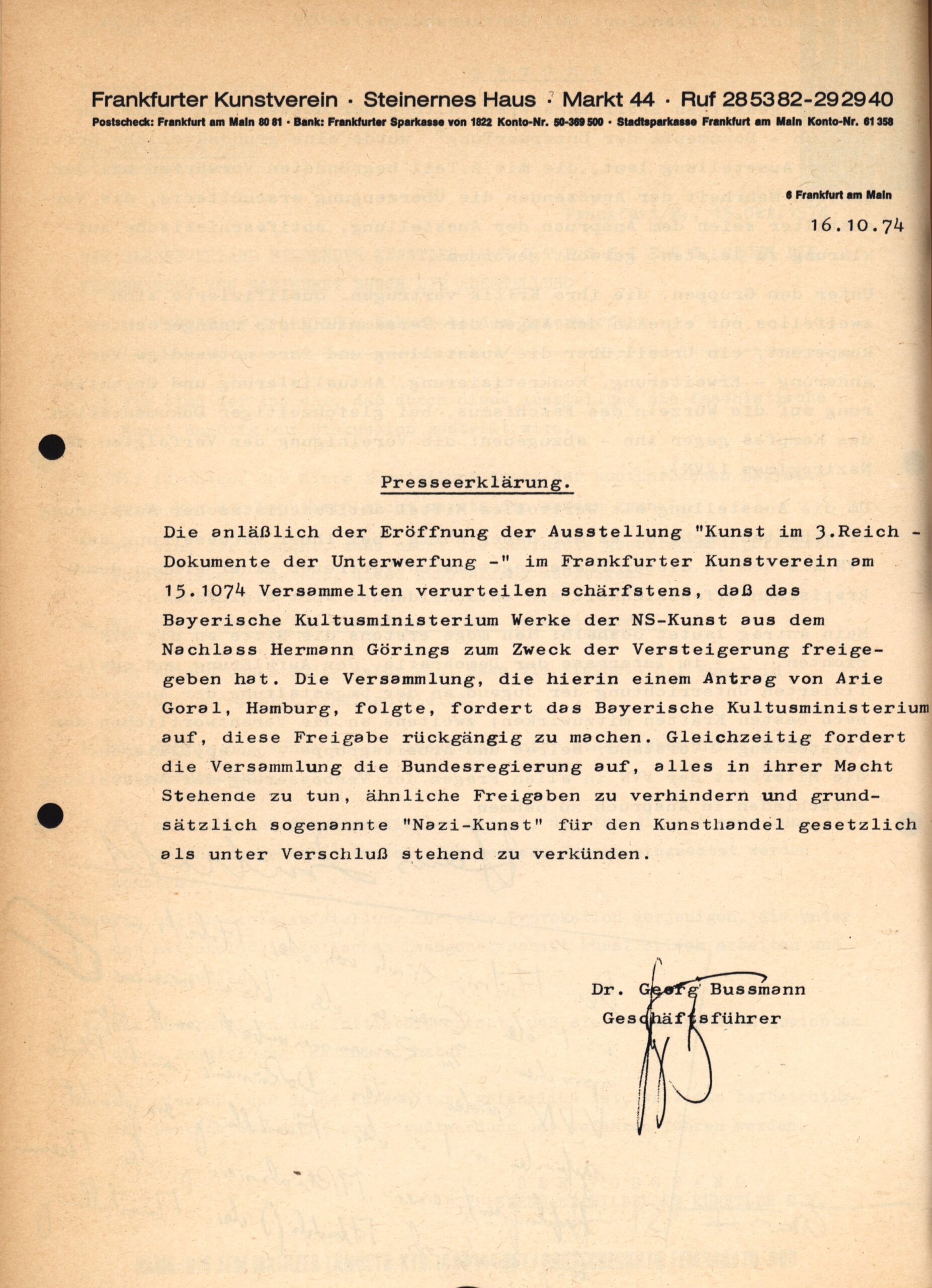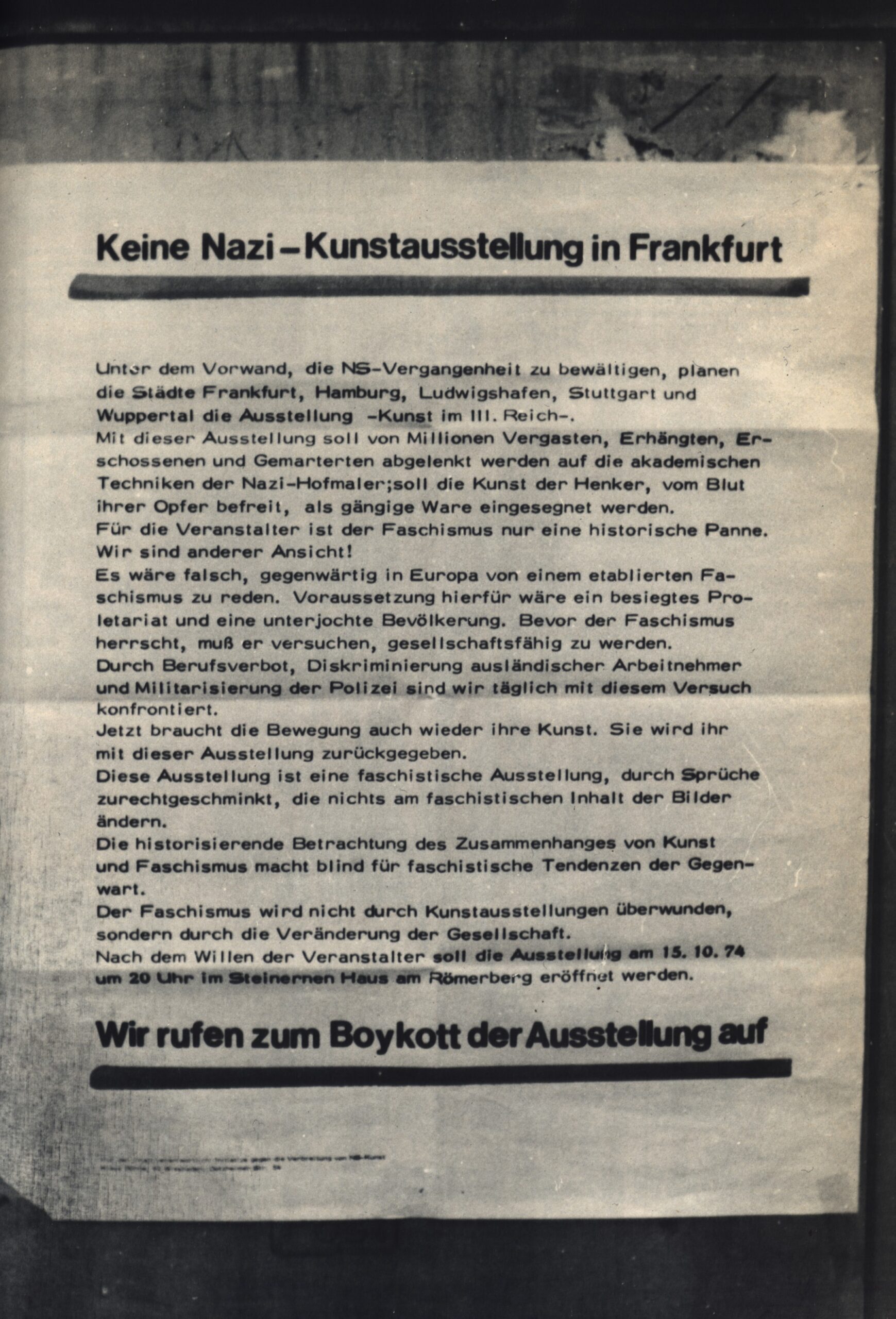 Georg Bussmann, der als Leiter des Frankfurter Kunstvereins in den 1970er Jahren Lehraufträge am KGI erhielt, verwendete seine Lehrtätigkeit darauf, gemeinsam mit Berthold Hinz und Arbeitsgruppen mit Studierenden des KGI, Ausstellungen zu realisieren. Neben einer Kollwitz-Ausstellung, die 1973 u.a. im Frankfurter Kunstverein stattfand, löste insbesondere die 1974 gezeigte Ausstellung „Kunst im 3. Reich: Dokumente der Unterwerfung“ eine breite Kontroverse aus, die ergänzend zum Ausstellungskatalog in einer eigens erstellten Publikation zusammengetragen wurde. Aus heutiger Sicht besonders innovativ, ist der gezielte und teils konfrontative Einsatz von Text und großformatigen Reproduktionen als zentraler Bestandteil des Ausstellungsdisplays. Hinz, der von 1971 bis 74 am KGI lehrte, tat sich in dieser Zeit als namhafter Forscher zum Nationalsozialismus hervor. Seine Monografie „Die Malerei im deutschen Faschismus. Kunst und Konterevolution“ (München 1974) erschien 1975 in italienischer und 1979 in englischer Übersetzung. 1977 fand im Historischen Museum Frankfurt außerdem die u.a. von Hinz (im Namen des Ulmer Vereins) organisierte Tagung „Faschismus –Kunst und visuelle Medien“ statt.