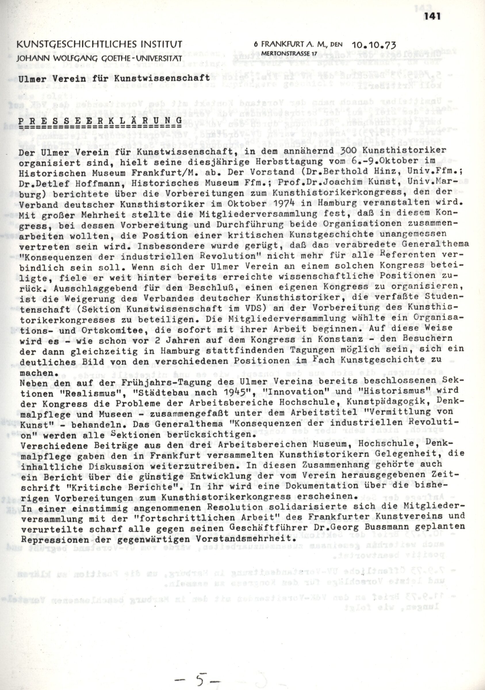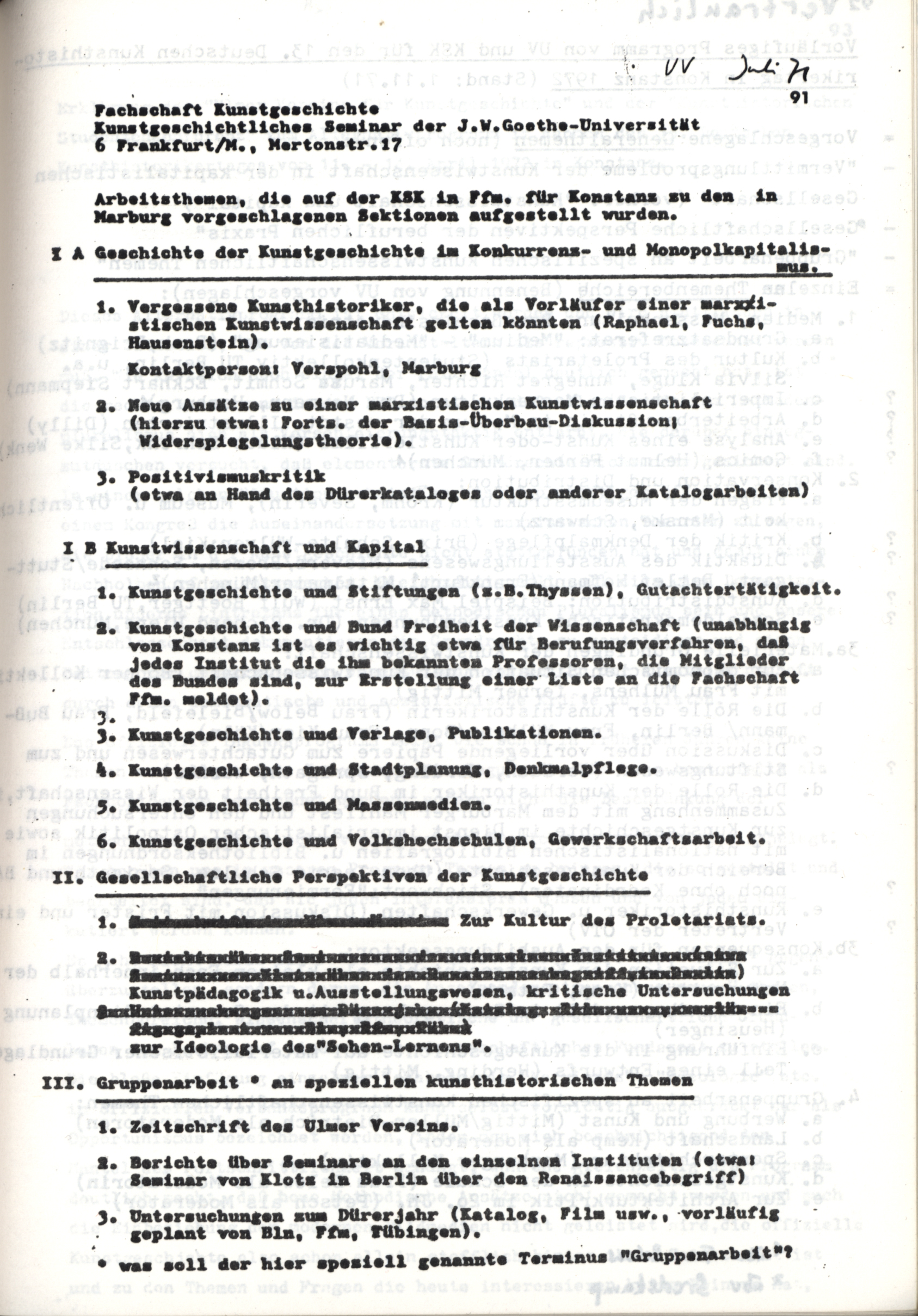 Mit Gründung des Ulmer Vereins (Verband für Kunst- und Kulturwissenschaften e. V.) wurden ab 1968 Reformbewegungen im Fach angestoßen, die auch von Frankfurt aus vorangetrieben wurden. Dokumentiert ist etwa das Engagement der Frankfurter Fachschaft, die sich an der Organisation eines alternativen Kunsthistorikerkongresses (1972 in Konstanz) beteiligt sowie im gleichen Jahr den Kunsthistorischen Studierendenkongress (KSK) ausrichtet.